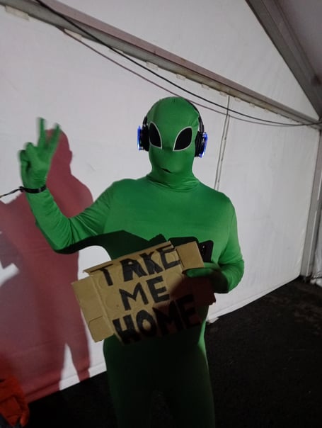 Adrian Grint, aged 46, from St Austell, dressed up as an alien for the occasion and waved around a sign saying 'Take Me Home.'