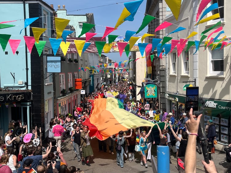 Thousands turned out to celebrate the 24th Falmouth Pride today (Saturday, April 25), with the 50m Cornwall Pride flag paraded through town from The Moor to Events Square.