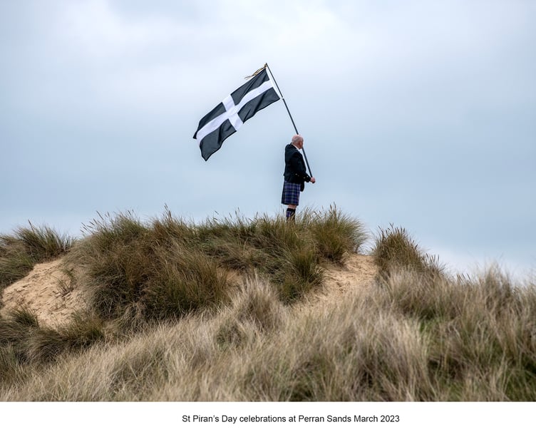 A ladder mishap took out the intended role-player earlier in the week so Sefryn Penrose, daughter of the late St Piran’s Trust chairman Perran, and herself a trust member, stepped into the robes as a last-gasp St Piran’s Day replacement for the re-enactment of the arrival of the county’s patron saint at the place where his once-lost oratory was built.