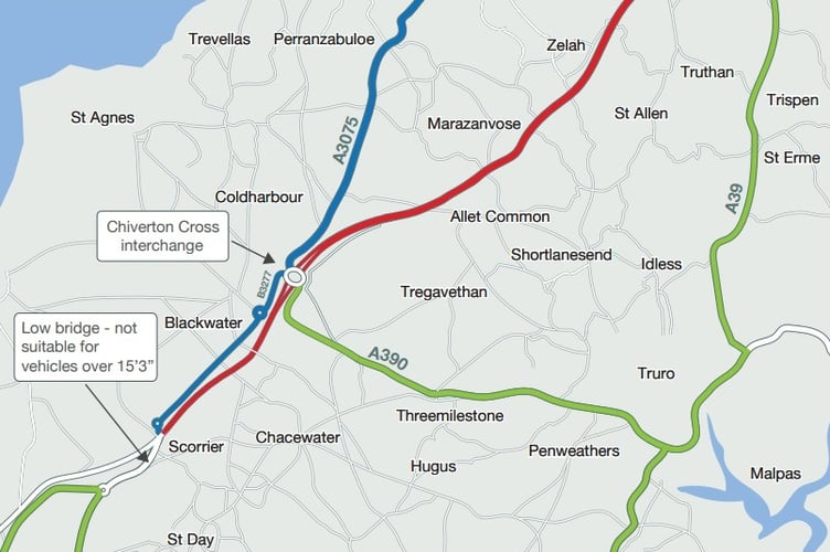Due to a low bridge (4.7 metres) at Scorrier, HGVs will be diverted via the A39 at Carland but also have the option to divert to the A390 at Chiverton.