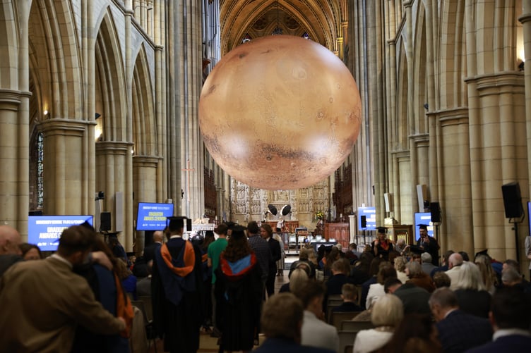 STUDENTS from University Centre Truro & Penwith graduated under a seven-metre replica of Mars on Saturday [October 18]. More than 700 people attended the sold-out ceremony at Truro Cathedral, which is currently hosting artist Luke Jerram’s Mars: War and Peace.