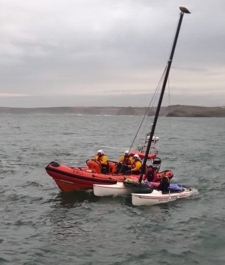 NEWQUAY lifeboat volunteers launched after a catamaran got into difficulty in Newquay Bay.