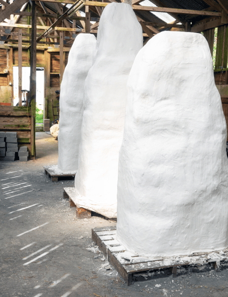 “In making the Monoliths, we have used direct casts, alongside the varied geologies, flora and waste materials found at sites across the town, embedding them into unique sculptural fragments of the landscapes, mirroring this ancient tradition whilst encapsulating another layer of the place itself. Now more than ever, communities need spaces to gather, listen, and learn from one another.