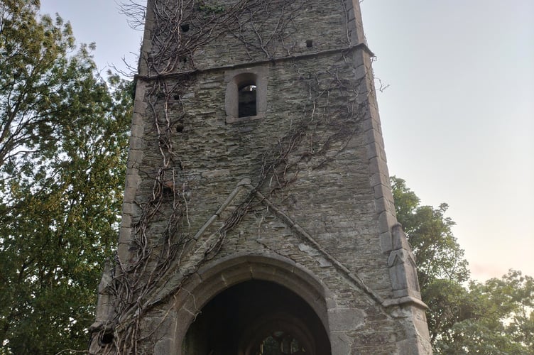 At the end of a long lane there is a big farm, and by it you can see, through a few trees, a church. As you approach the church, though, you can see that the tower is half-ruined, and none of the rest of the church remains, just a tidy, peaceful churchyard.